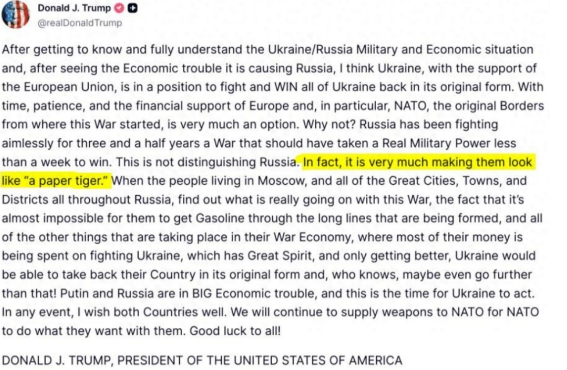 过去一年多里,特朗普一直持有相对孤立的立场,主张乌克兰应接受现实、选择停火,甚至施压基辅政府做出领土让步。他曾质疑美国对乌克兰的巨额援助是否可持续,并认为该国不应承担过多的战争成本。然而,这一切在他与欧洲盟友的力劝下发生了剧变。特朗普声称,尽管战争已经持续了三年多,但乌克兰在西方的持续财务和军事支持下,有望重新恢复到战争开始时的原有边界。他直言不讳地指出,俄罗斯现在已经如同一个“纸老虎”,而这一强势表态代表着他近乎180度的政策转变。